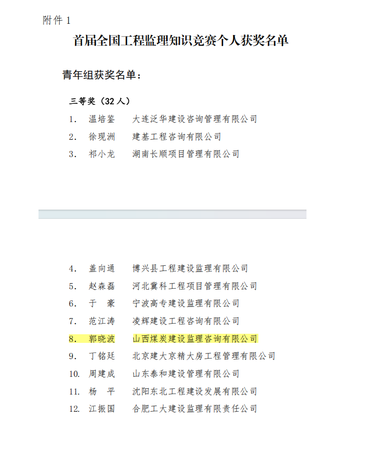 12月12日,中國(guó)建設(shè)監(jiān)理協(xié)會(huì)公布了“首屆全國(guó)工程監(jiān)理知識(shí)競(jìng)賽”獲獎(jiǎng)名單,我公司職工郭曉波憑借卓越的專業(yè)素養(yǎng),在競(jìng)賽中一路披荊斬棘,在眾多參賽選手中脫穎而出,取得青年組三等獎(jiǎng)的優(yōu)異成績(jī)。