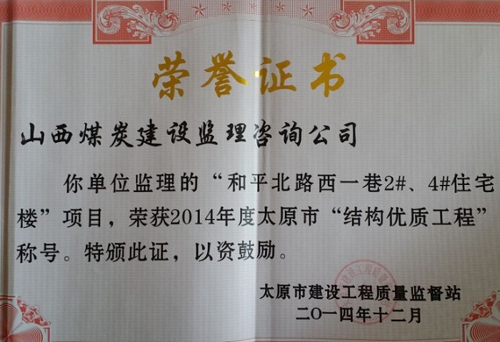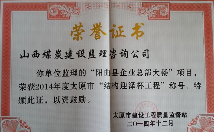 由我公司監(jiān)理的陽曲縣企業(yè)總部大樓榮獲“2014年度結(jié)構(gòu)迎澤杯工程”,太原市和平北路西一巷2#、4#住宅樓榮獲“2014年度結(jié)構(gòu)優(yōu)質(zhì)工程”。